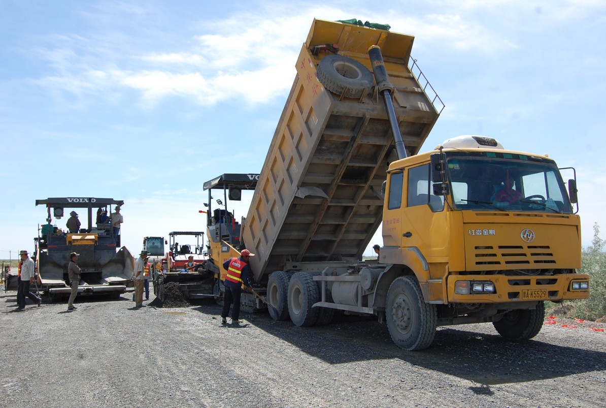 圖為奎車(chē)公路水穩層攤鋪施工場(chǎng)面